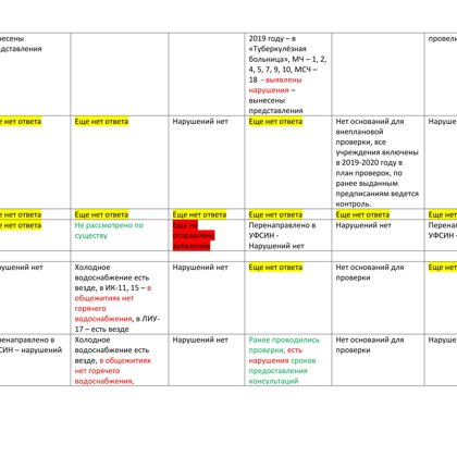 Сводная рабочая таблица результатов наших проверок исправительных учреждений по вопросам: